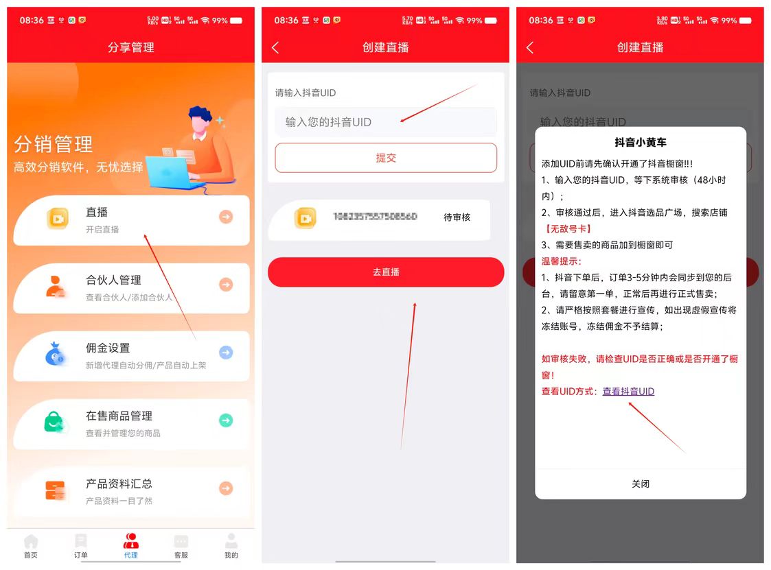 开通抖音橱窗之后,按照下方图片步骤进行信息登记,登记你的抖音UID等待审核即可,抖音UID查询方式点击红色按钮去直播,会有弹出教程,或者抖音上也有如何获取uid的视频教程,提交UID之后两天内审核完成。
